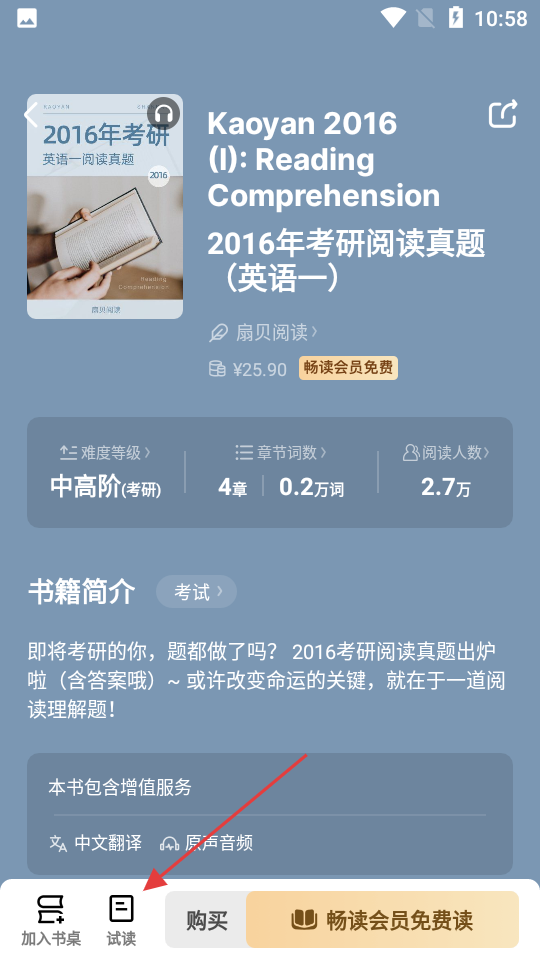 4、在书籍详情页点击【试读】,即可进入真题阅读界面,开始试读学习。