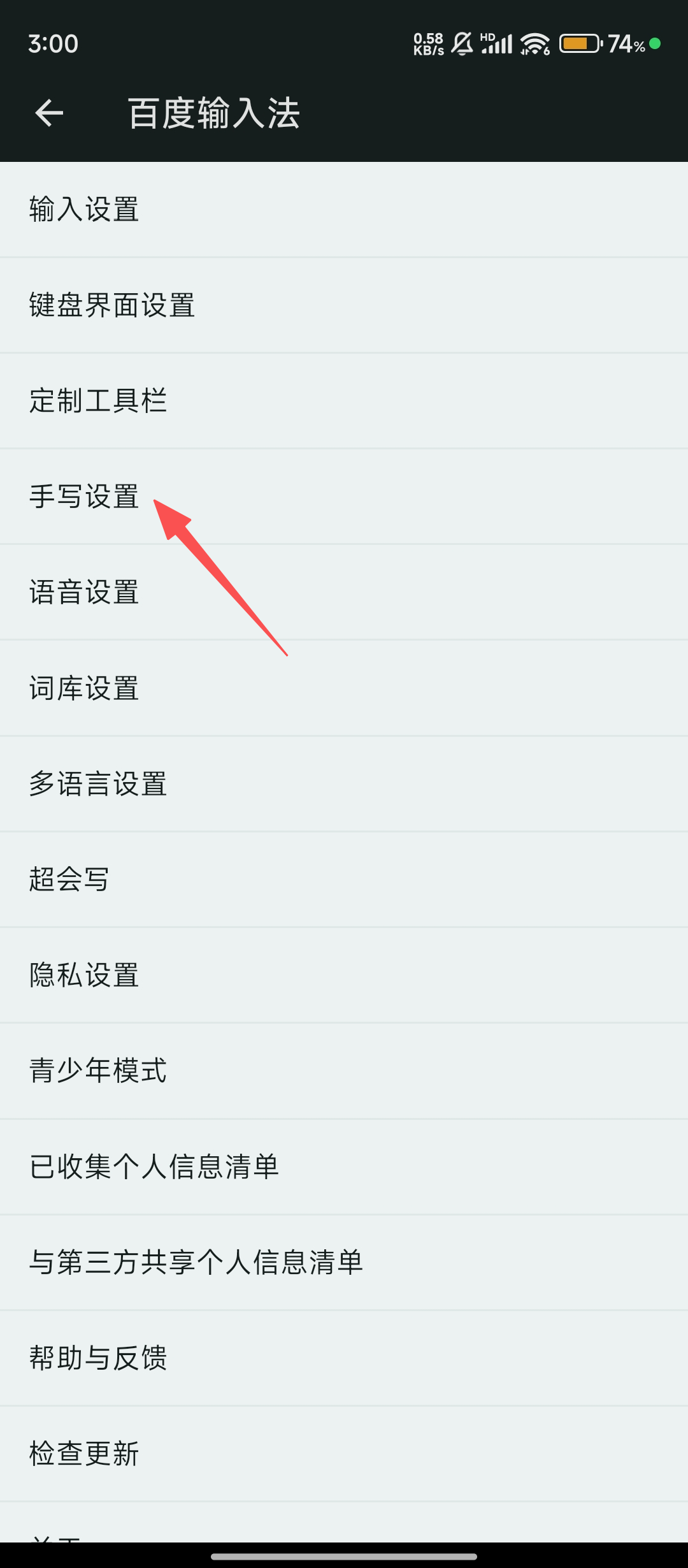 3、进入百度输入法设置后,我们点击【手写设置】,就能进入手写参数调整页面啦。