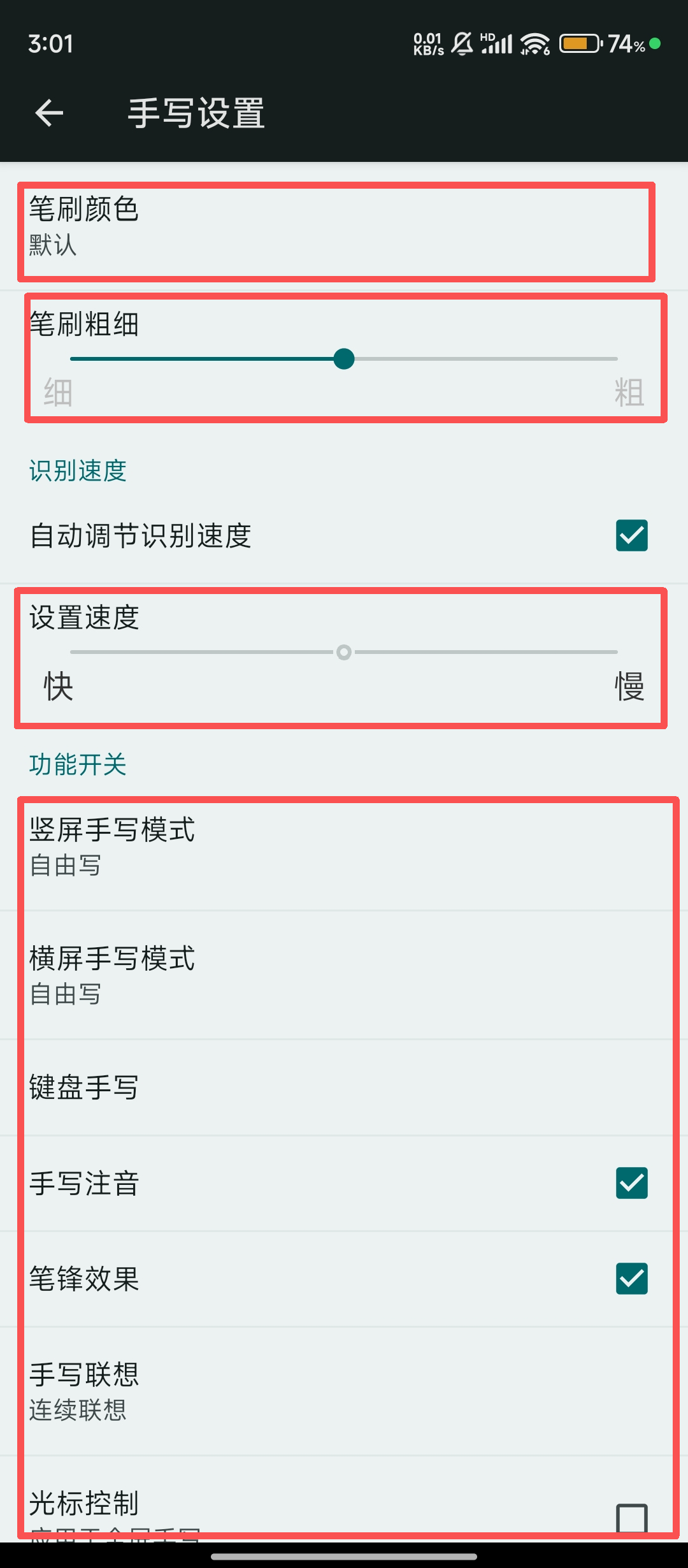4、在【手写设置】里,我们可以调整【笔刷颜色】等参数,还能设置手写模式、功能开关,让手写输入更合心意哦。