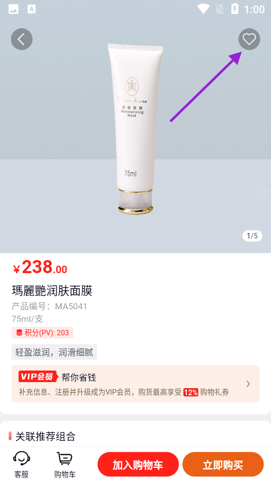 4、在商品详情页点击右上角心形图标,完成商品收藏操作。