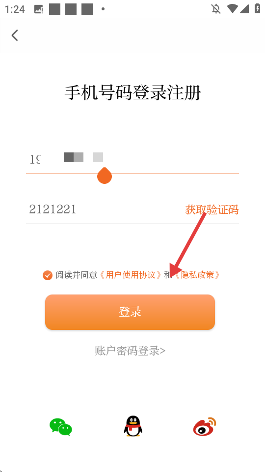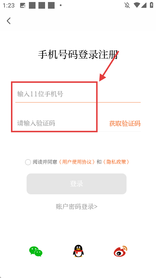 2、在个人页面点击【点击登录】,进入手机号码登录注册页面。