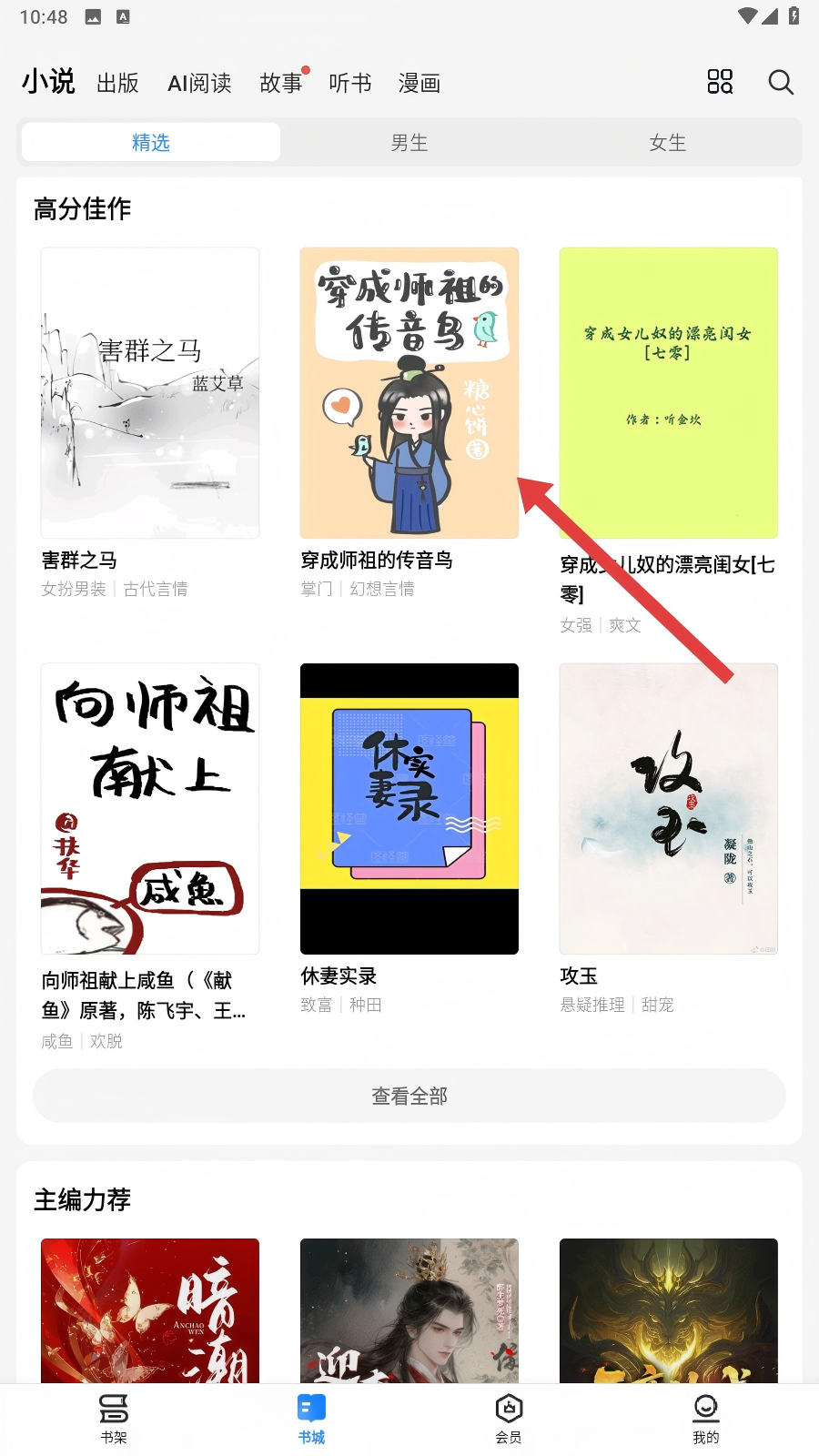 1、打开掌阅书城,在高分佳作区域选择感兴趣的书籍,如【穿成师祖的传音鸟】,点击进入书籍详情页呢。