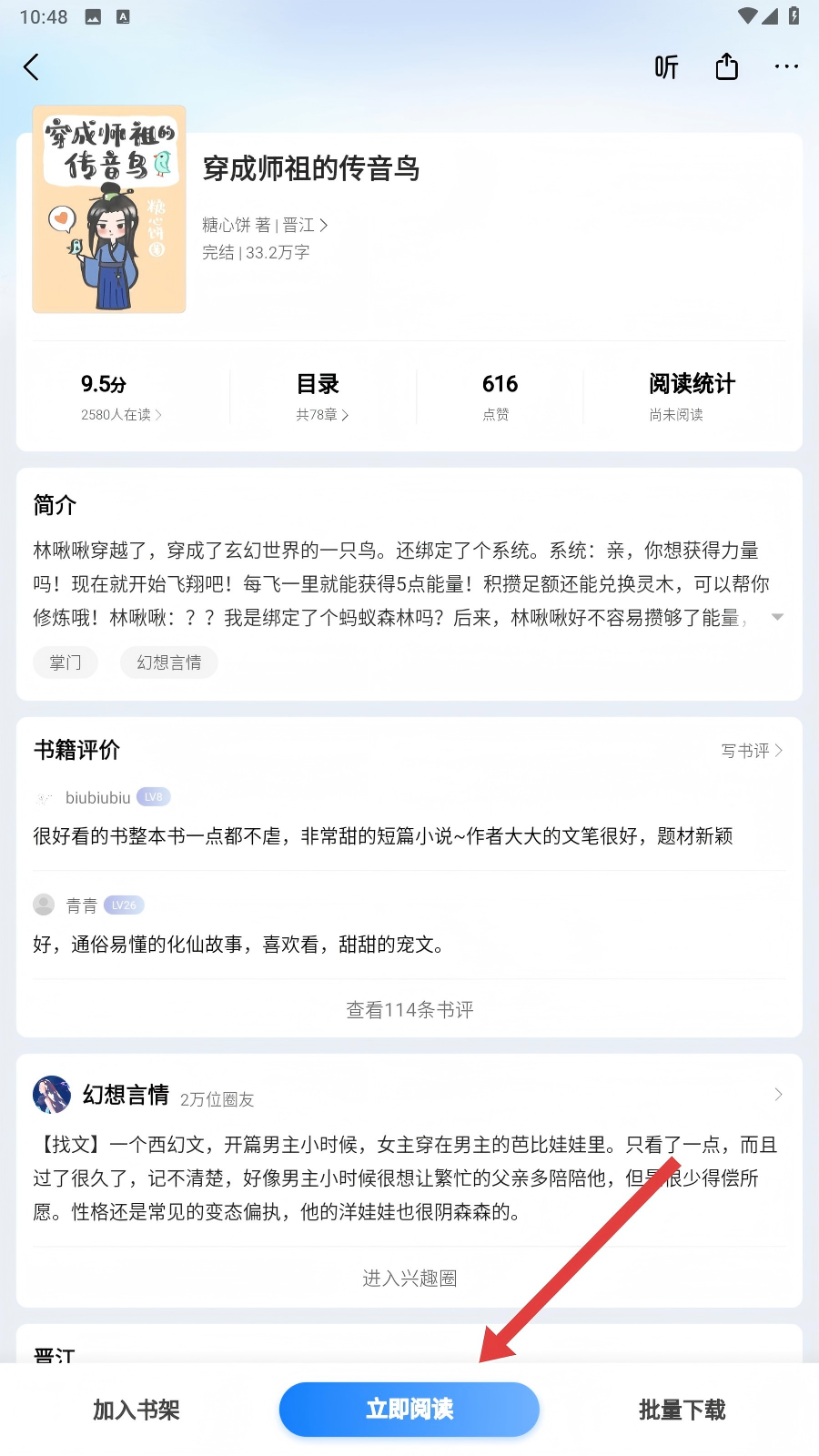 2、在书籍详情页,点击【立即阅读】,进入书籍阅读界面呀。