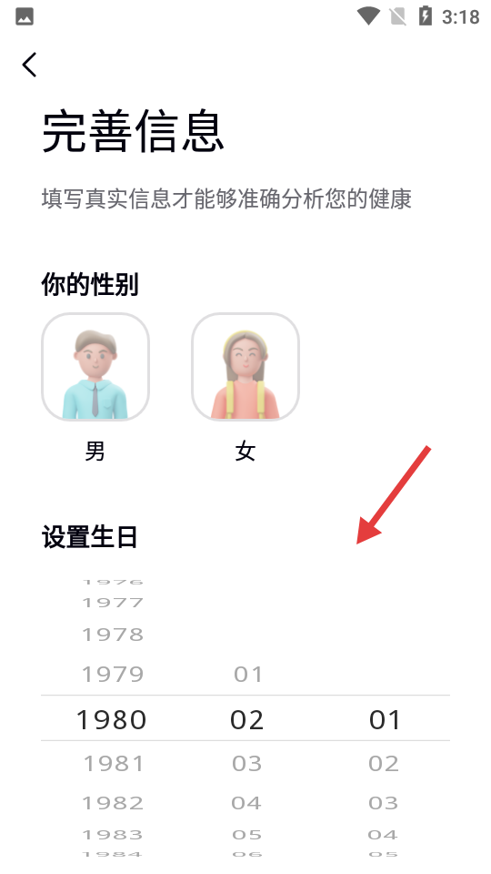 4、登录后进入【完善信息】页,完善个人信息以便准确分析健康状况。