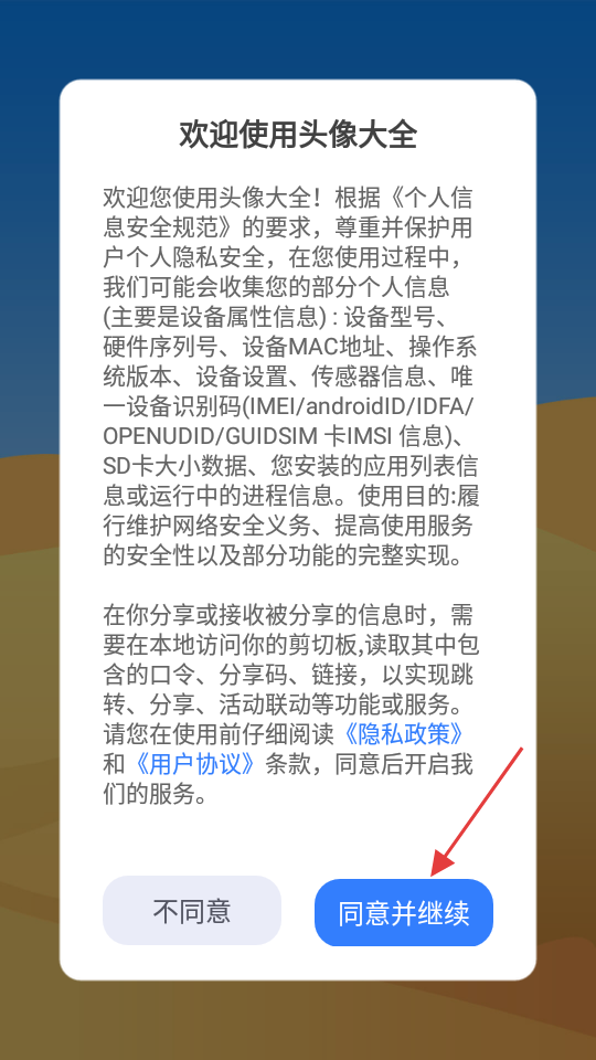 1、阅读《隐私政策》和《用户协议》,点击【同意并继续】,进入APP。