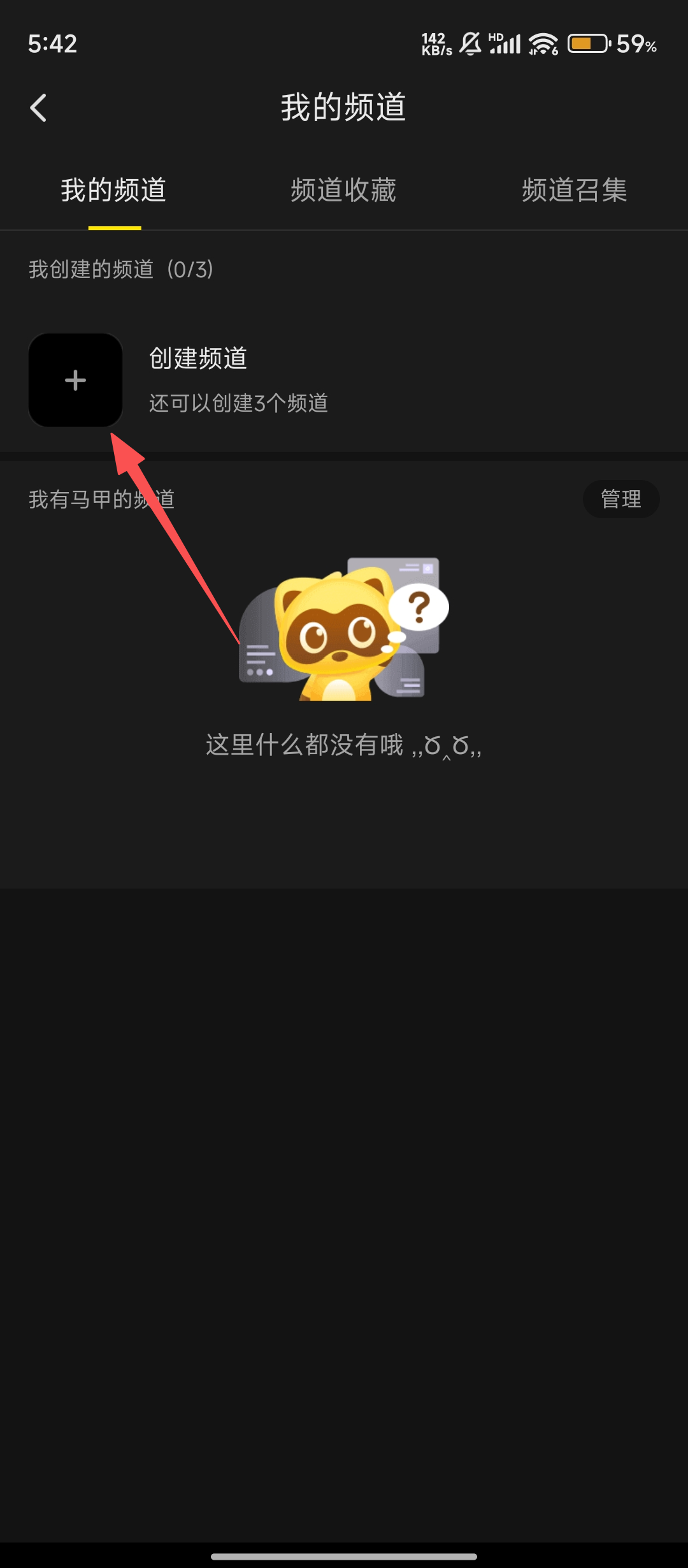 2、在页面可以看到我的频道,频道收藏,频道召集,点击下面的【创建频道】