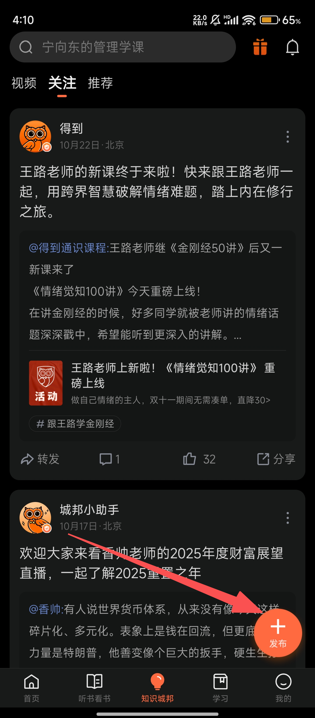 2、在知识城邦页面,点击右下角【+发布】,进入写笔记界面,准备记录灵感哦。