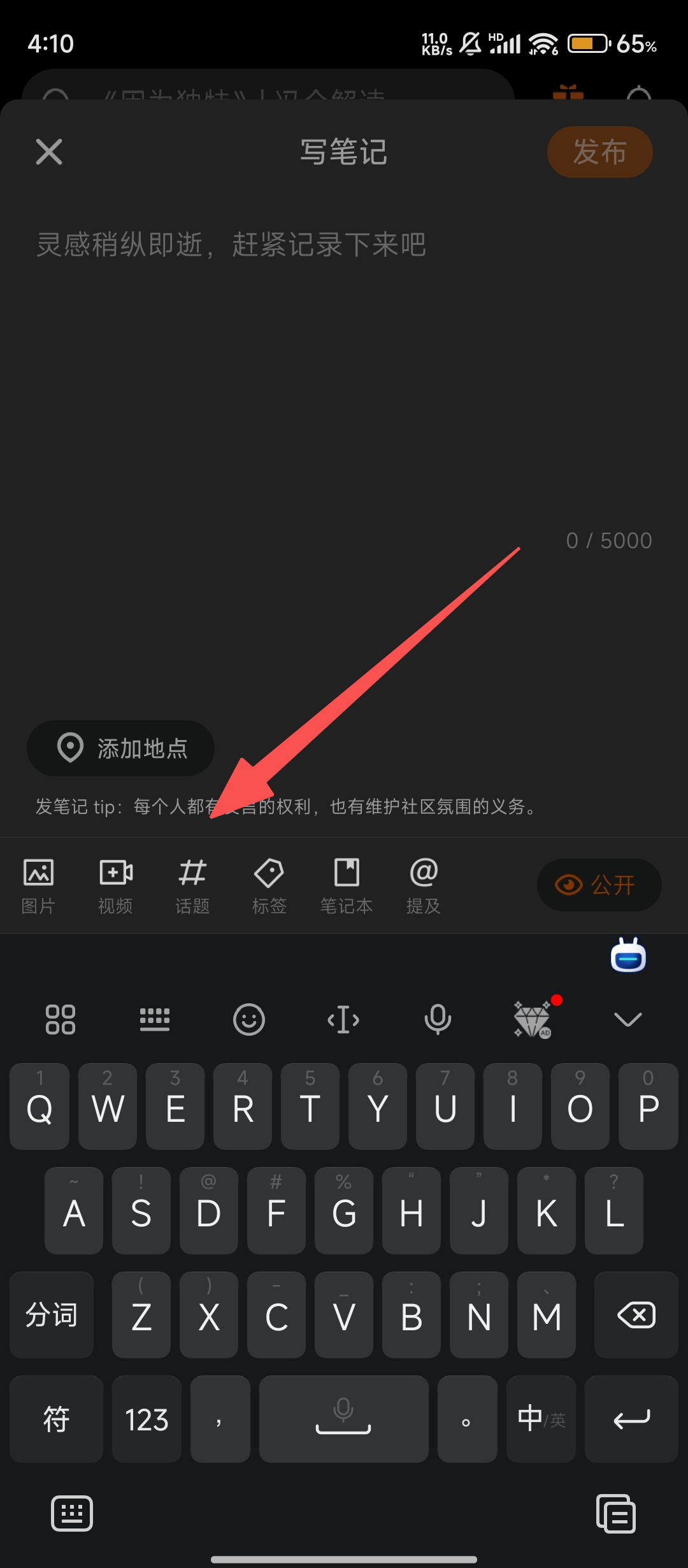 3、在写笔记界面,点击【话题】按钮,可添加相关话题,让动态更具针对性呢,写好后点击【发布】即可。