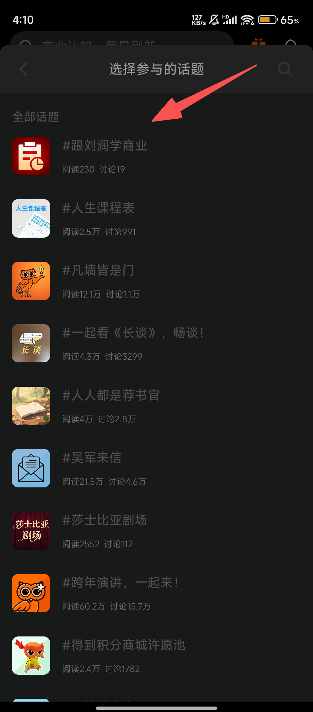 4、若要挑选如【#跟刘润学商业】等感兴趣的话题,可以助力动态获得更多关注呀。