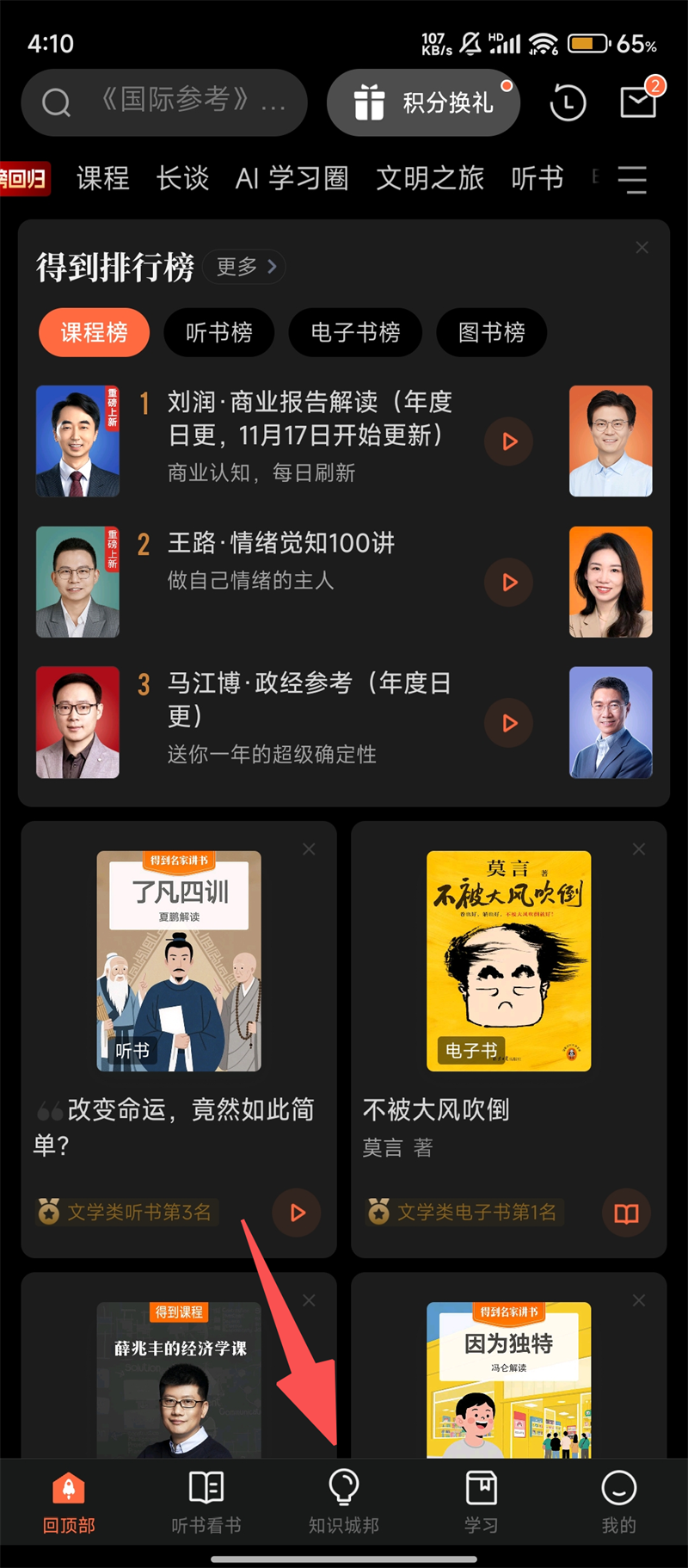 1、打开得到,点击底部【知识城邦】,进入知识分享社区,开启发动态的操作啦。