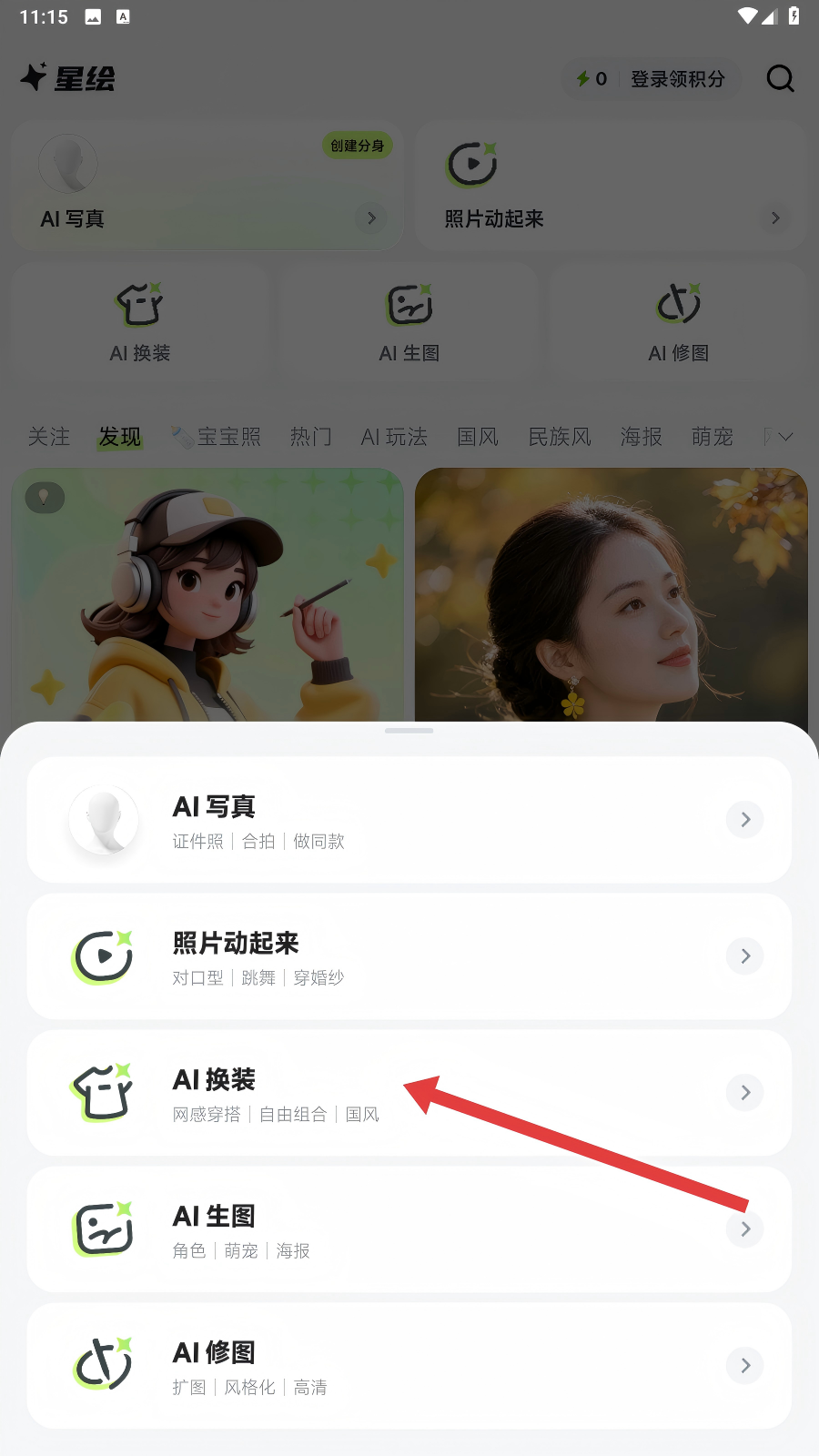 1、打开星绘app,在首页能看到AI写真、AI生图等功能,以及丰富的作品推荐
