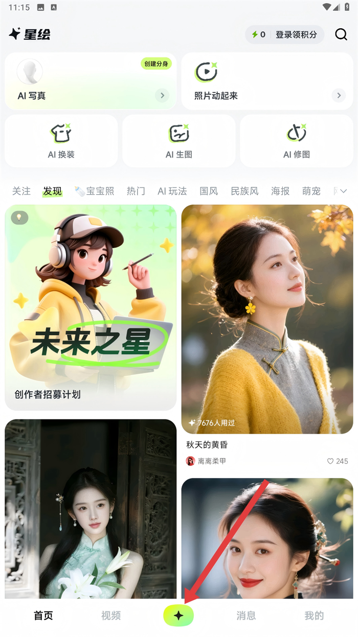 1、打开星绘App主界面,点击底部星型按钮,开启你的AI创作之路哦。