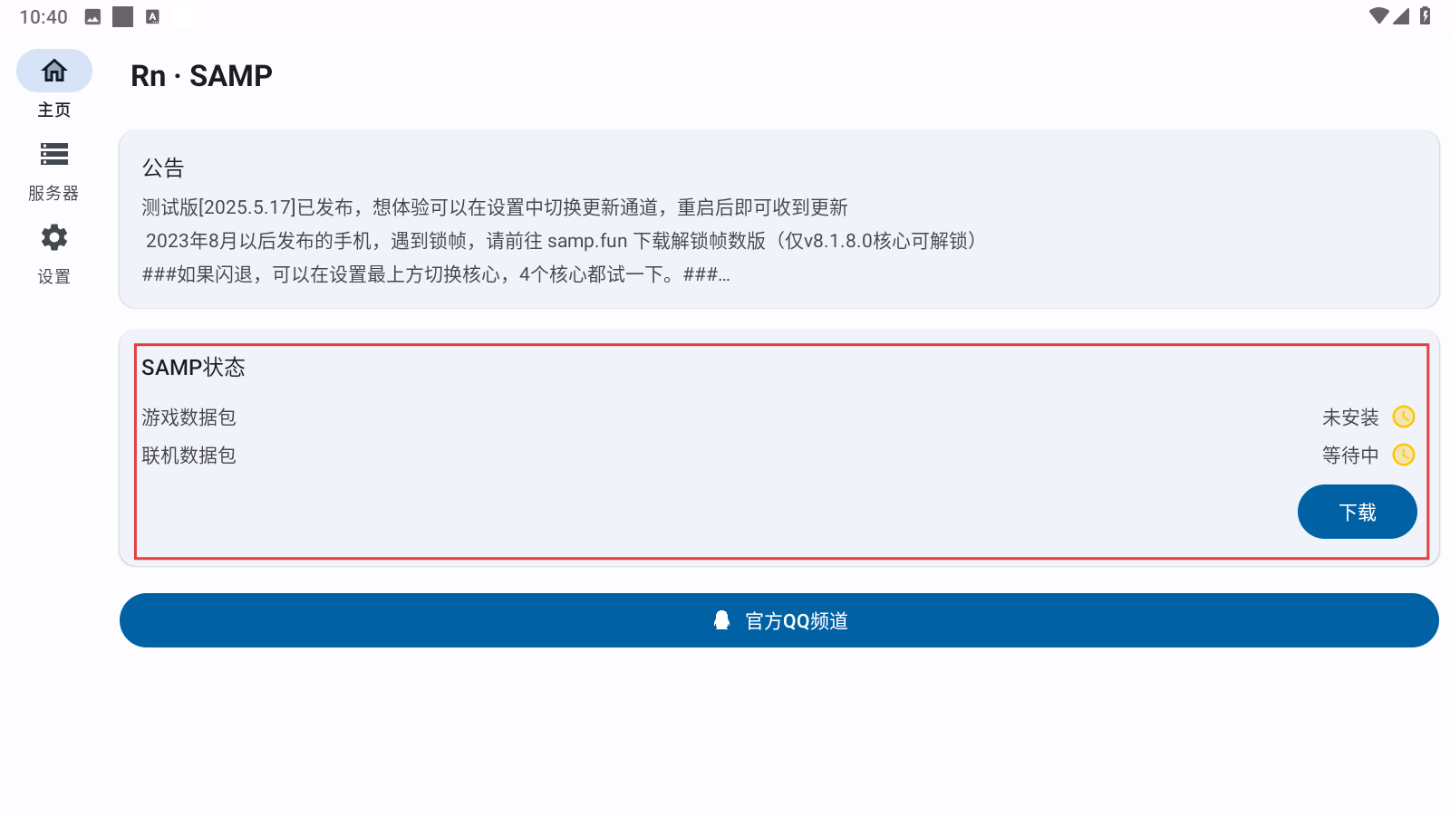1、在主页查看SAMP状态,点击【下载】安装数据包。