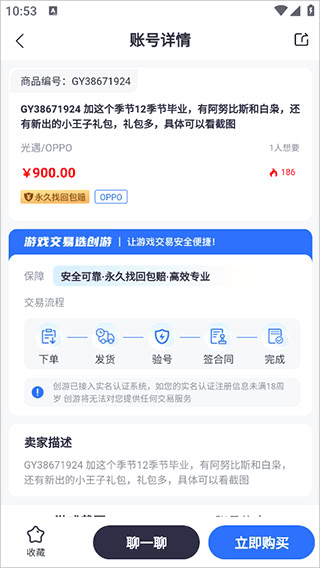 4、对交易流程或游戏账号信息需进一步了解可点击【聊一聊】,与交易方继续沟通