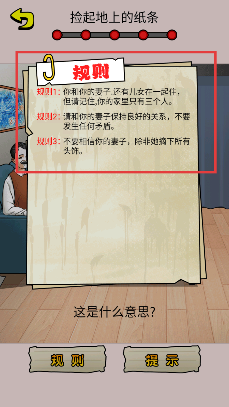 2、捡起地上的纸条,仔细阅读并牢记规则内容,如家里人数、与妻子的相处要求等。