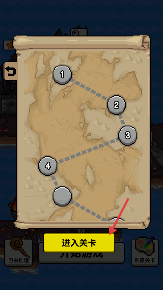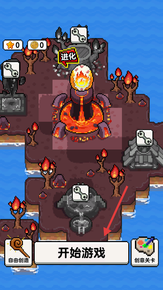 1、游戏主界面-点击【开始游戏】进入关卡选择-【自由创造】可自主设计-【创意关卡】体验特色玩法-优先从【开始游戏】开启冒险。
