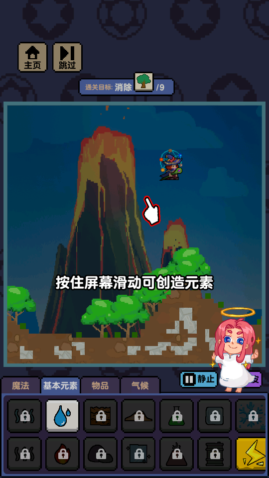 3、关卡内-按提示【按住屏幕滑动】创造元素-切换【基本元素】等分类-达成【消除树木-9】的通关目标-掌握操作解锁更多内容。
