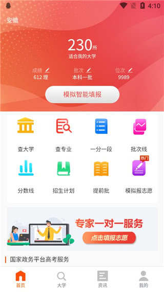 3、分数资料完善后,进入软件可查看查大学、查专业等实用志愿填报功能;