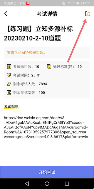 1、考试答案获取可通过刷题软件搜索,或在考试页面点击右上角分享按钮(如下图红色箭头所示)