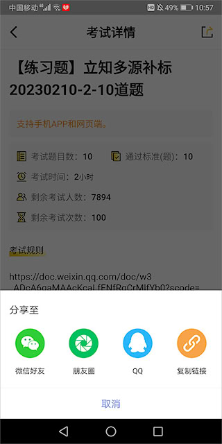 2、在底部分享面板选择平台,将页面分享给参加过同类考试的好友咨询答案。