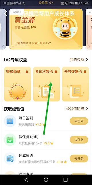 2、在新页面查看当前等级是否可领取考试次数卡权益(一张次数卡恢复一次考试资格)。