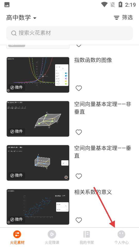 2、进入【火花素材】页面,选择【高中数学】分类,浏览对应学习素材。