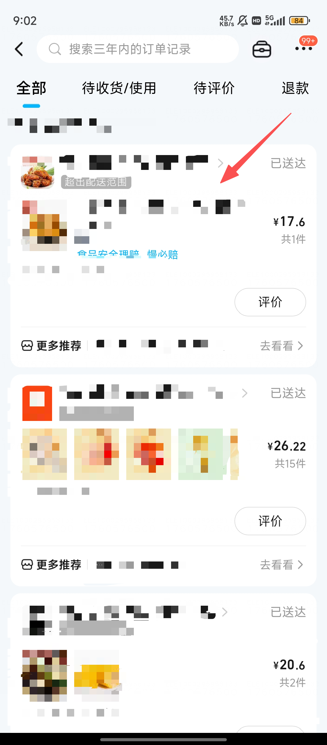 1、打开【饿了么】,在订单列表里找到要打赏骑手的那笔订单,点击进入就能查看订单详情啦。