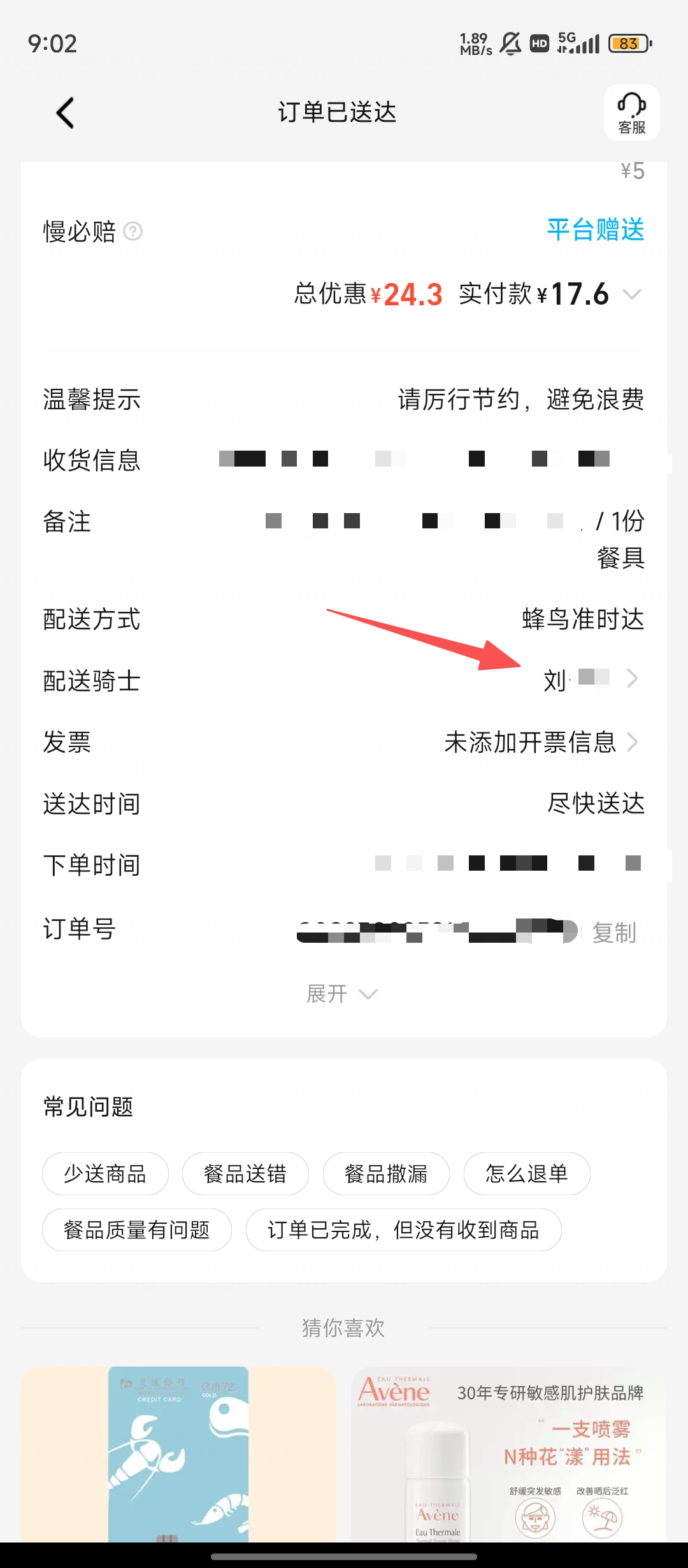 2、在订单详情页,找到【配送骑士】这一项,点击骑手名字,就能进入骑手的个人页面啦。