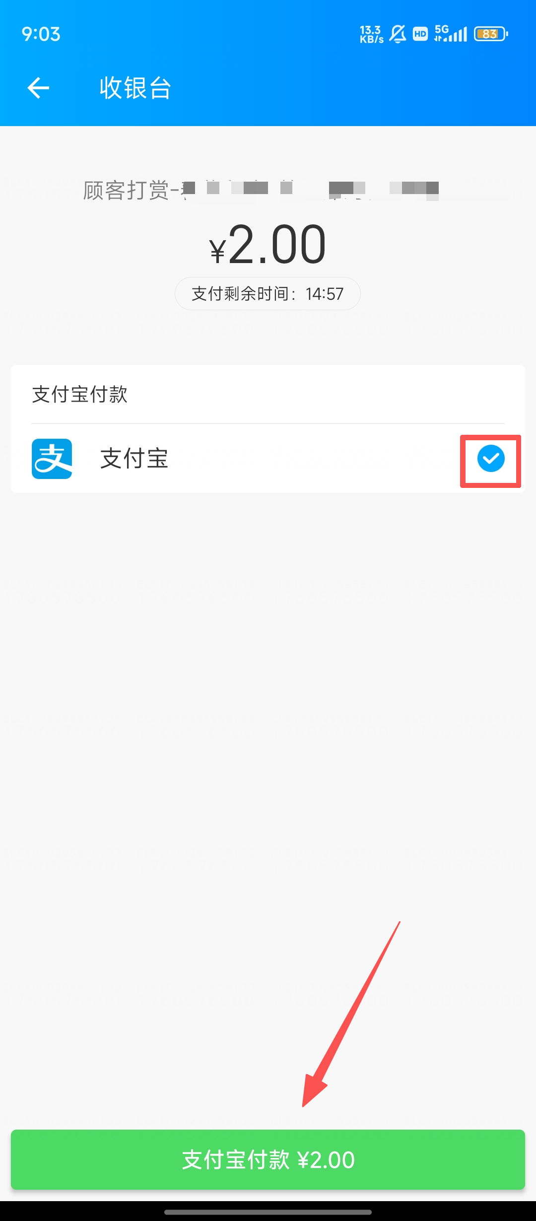 4、接着会跳转到收银台,确认支付方式,然后点击绿色的支付按钮,就能完成打赏啦。