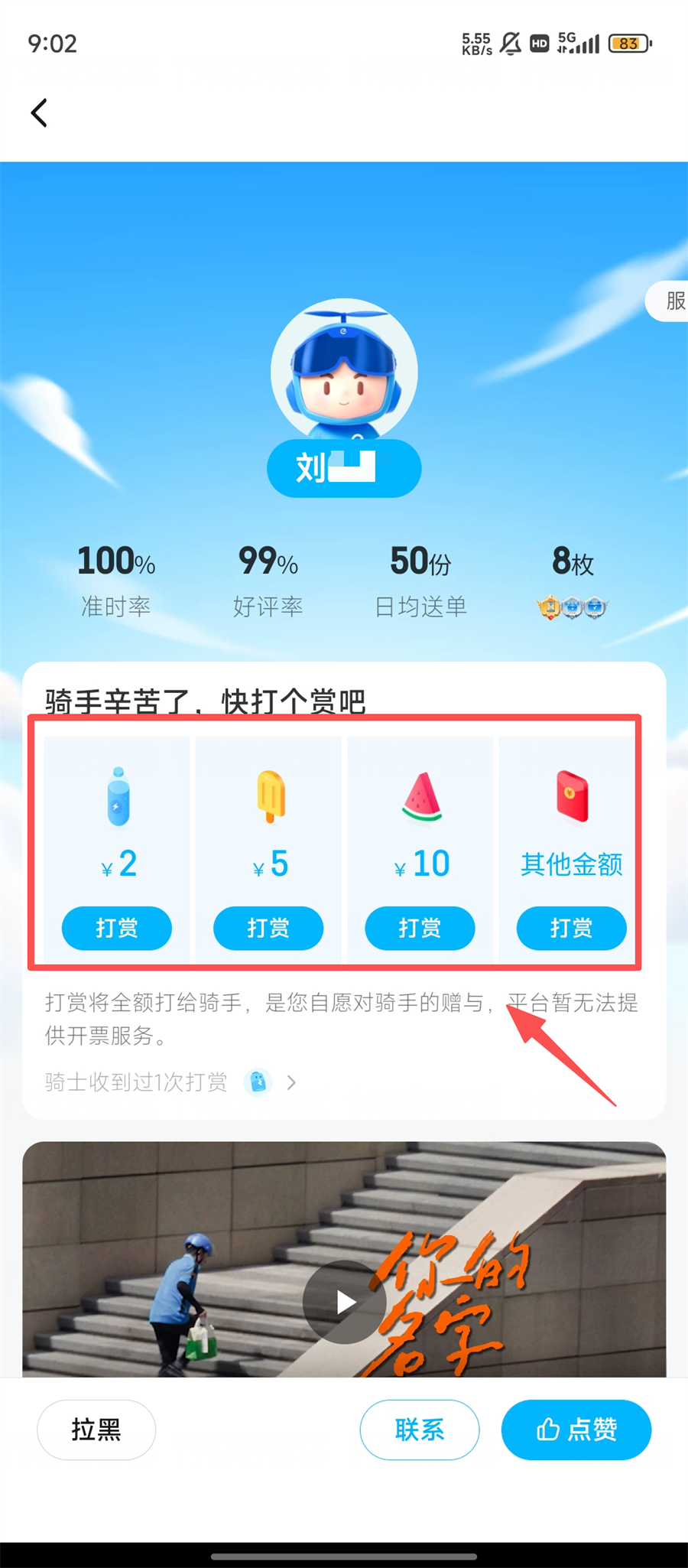 3、进入骑手页面后,能看到【2】、【5】等打赏金额选项,选好金额点击【打赏】按钮。