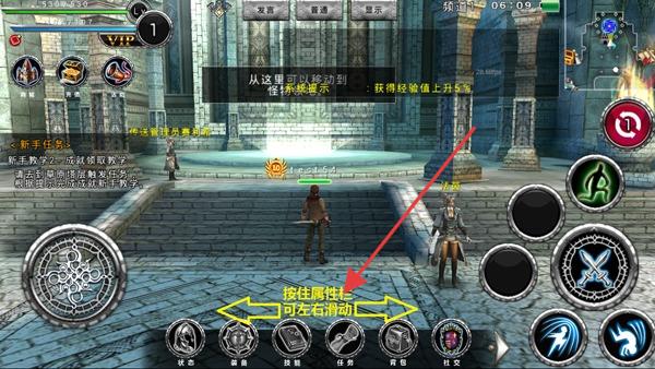 1、在初始界面,按住属性栏左右滑动,熟悉操作,接取【新手任务】。