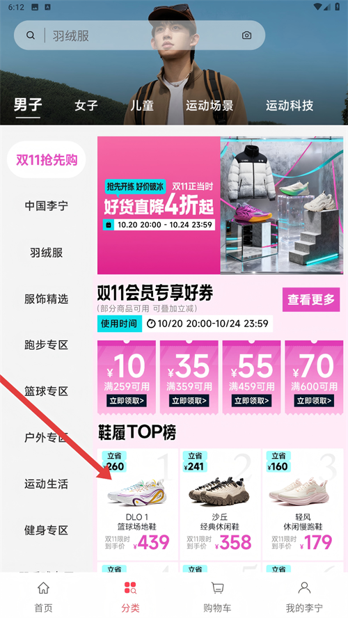 2、在分类页面,选择【男子】等性别分类,浏览【明星同款】等李宁商品。