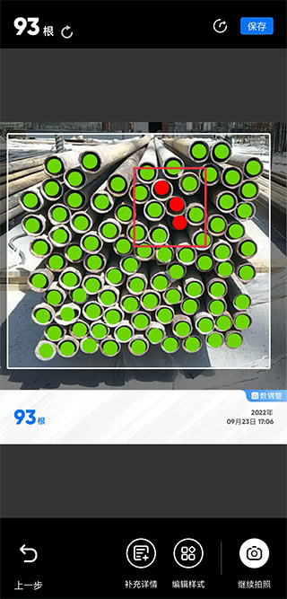 4、若发现存在漏数现象,可在图片上直接点击漏数钢管,手动点选的钢管会以红色标识,同时下方数量显示将自动递增。