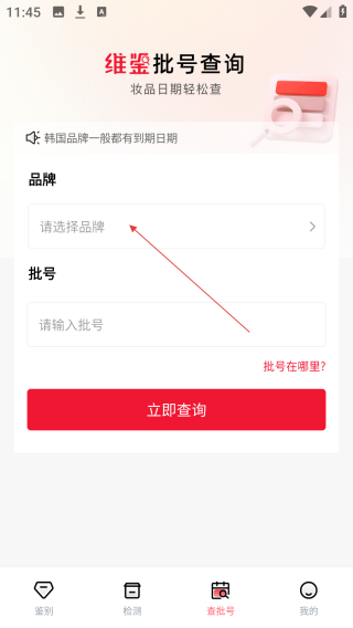 2、在批号查询页,点击【品牌】输入框,选择目标品牌。