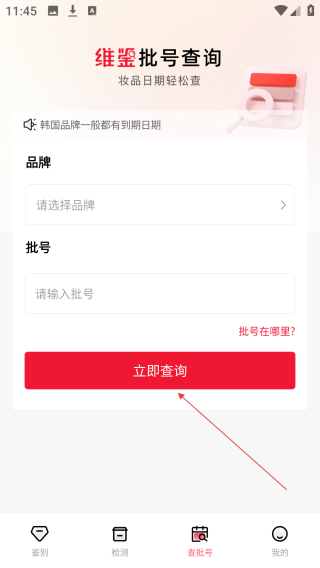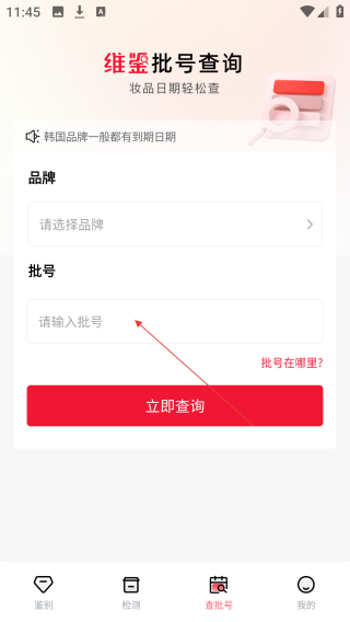 4、完成品牌和批号输入后,点击【立即查询】,获取商品信息。