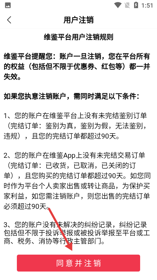 4、确认满足注销条件后,点击【同意并注销】,完成账号注销操作。