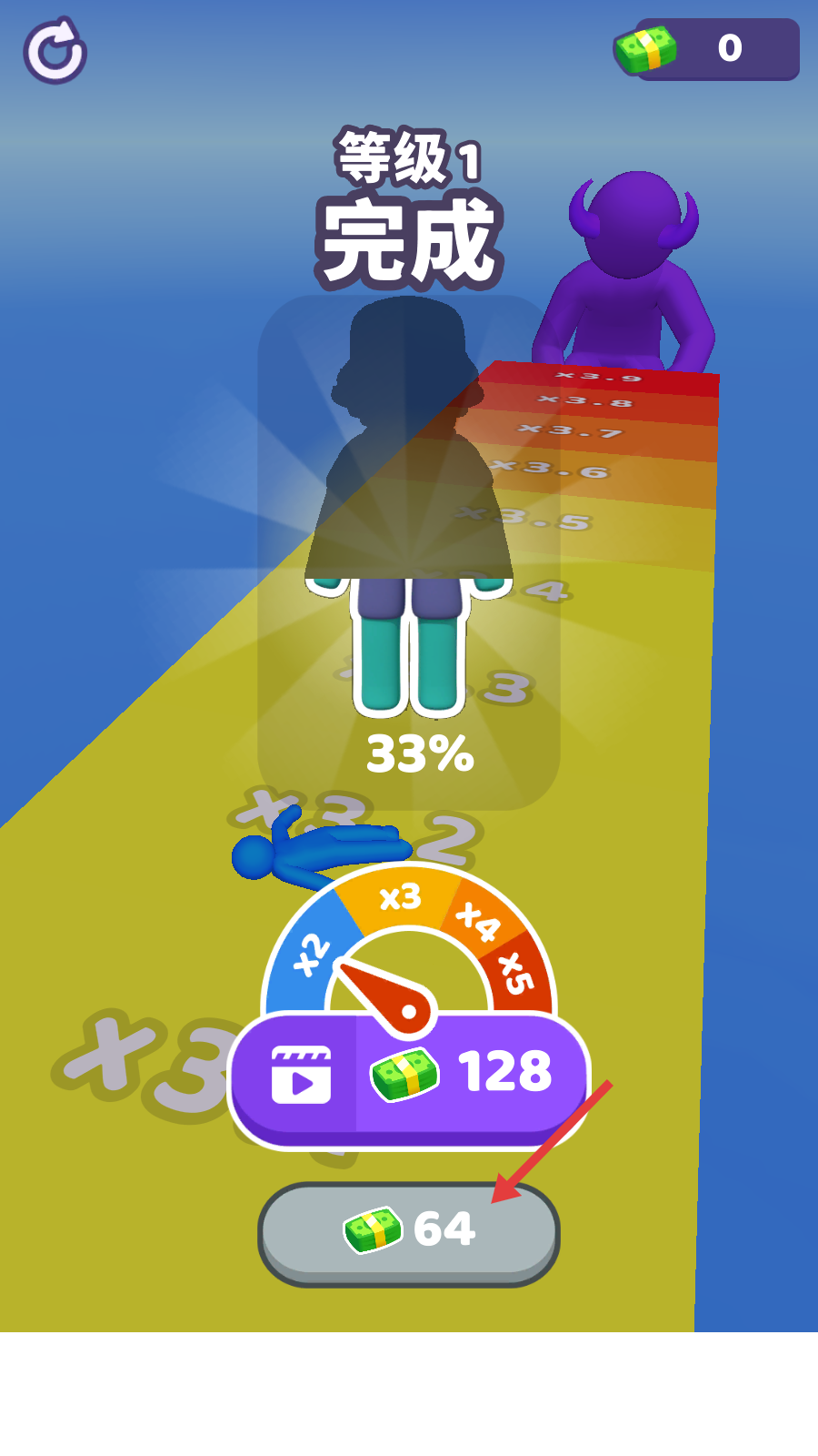 4、到达终点后,等级1完成,可领取64元游戏货币奖励。