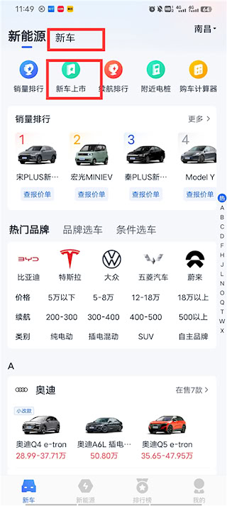 1、进入软件首页,有销量排行、新车上市等功能,查询最新汽车报价可点击“新车上市”。
