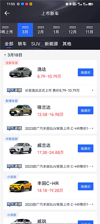 2、在新车上市中,有即将上市和每月份上市新车日历,及轿车、SUV等分类,用户可选择喜欢的类型查询报价。