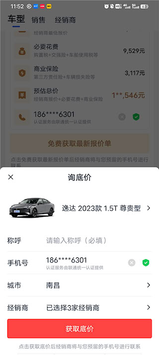 5、若想了解底价,可点击“获取底价”,留下电话和名字后点击查询,销售会电话联系用户。