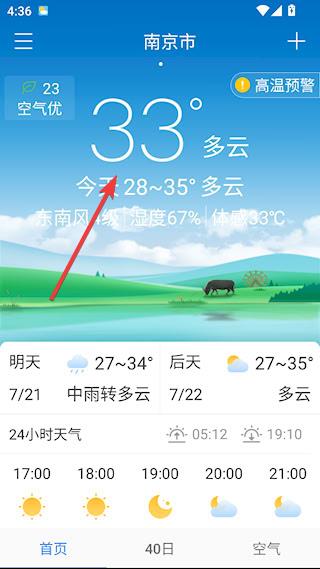 2、可看到当前温度、风级、湿度、体感温度等数据