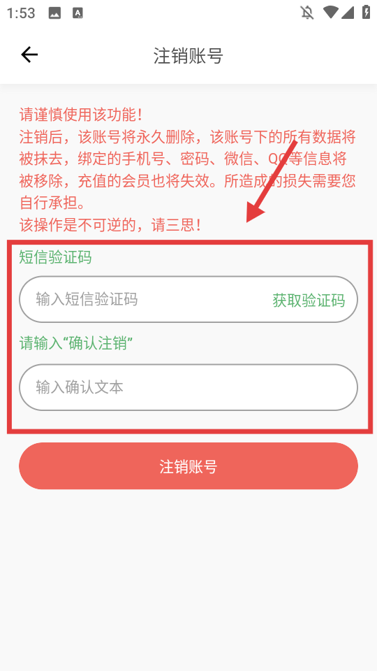 4、获取并输入短信验证码,输入“确认注销”文本后点击【注销账号】,完成账号注销操作。