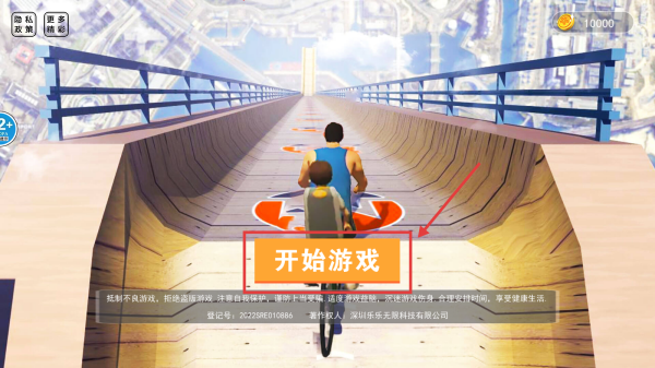 1、进入游戏,点击【开始游戏】,驾驶自行车开启送儿子上学的挑战之旅啦。