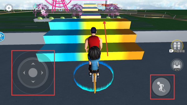 2、在操作界面,用左侧摇杆控制骑行方向,右侧按键控制跳跃,骑车时灵活操作,应对前方阶梯等障碍。