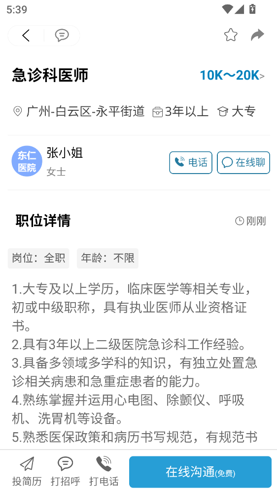 2、找到心仪的职位,可查看职位详情,点击在线沟通可了解更多信息,点击投简历就能开启求职啦