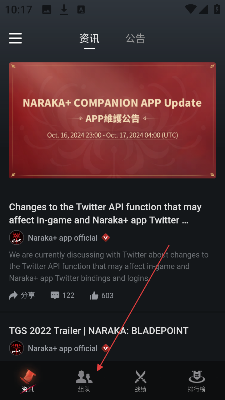 1、在资讯页面点击【组队】,进入组队页面。