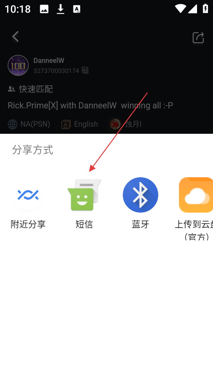4、在分享选项中选择【短信】,完成队伍分享操作。