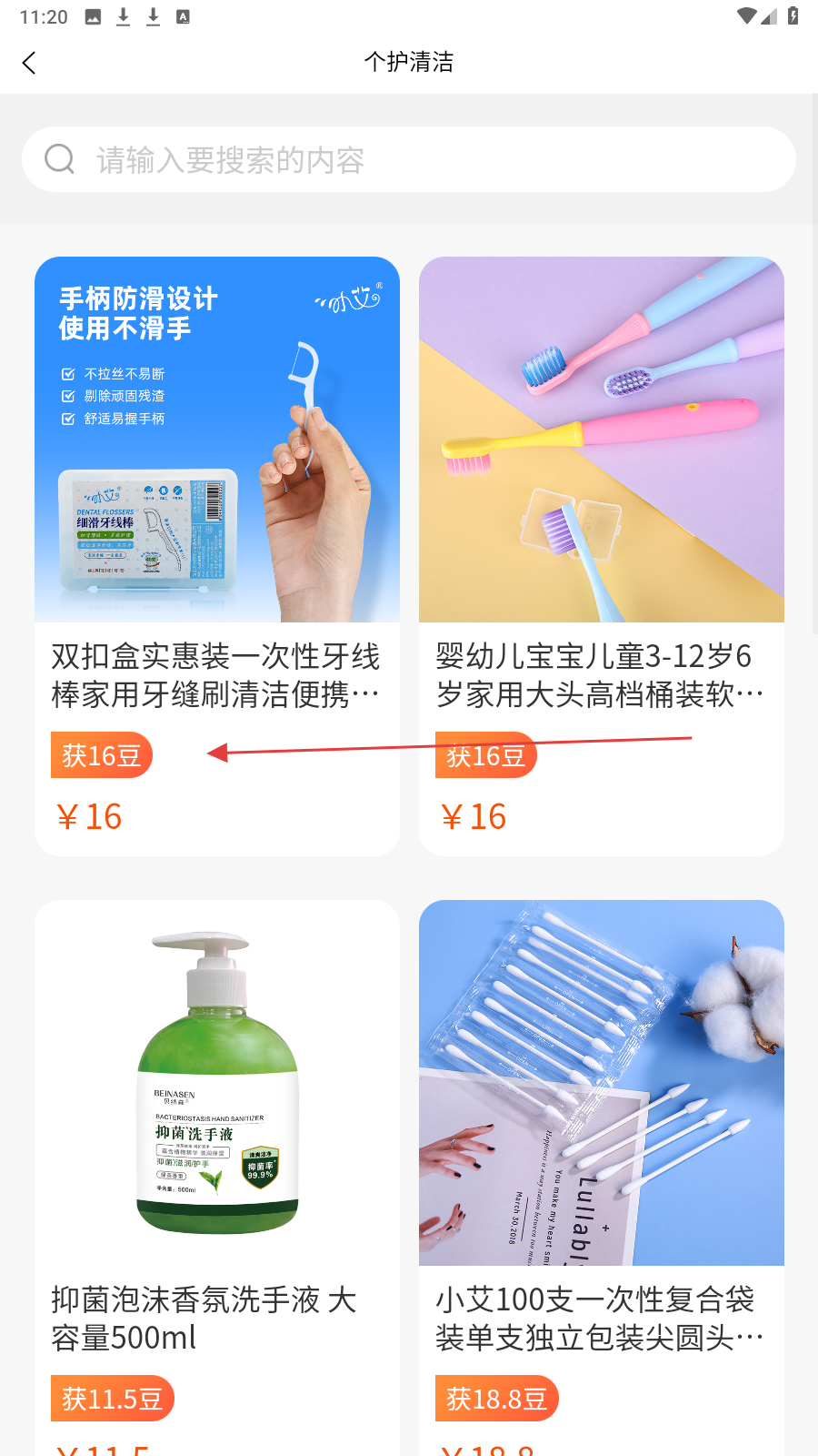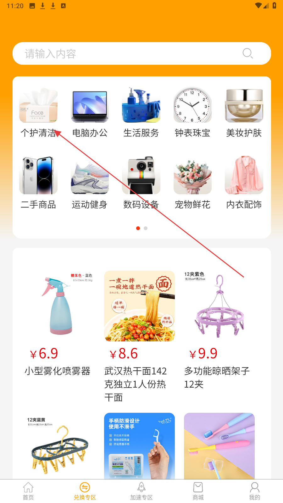 2、在兑换专区,点击【个护清洁】分类,浏览对应商品列表。