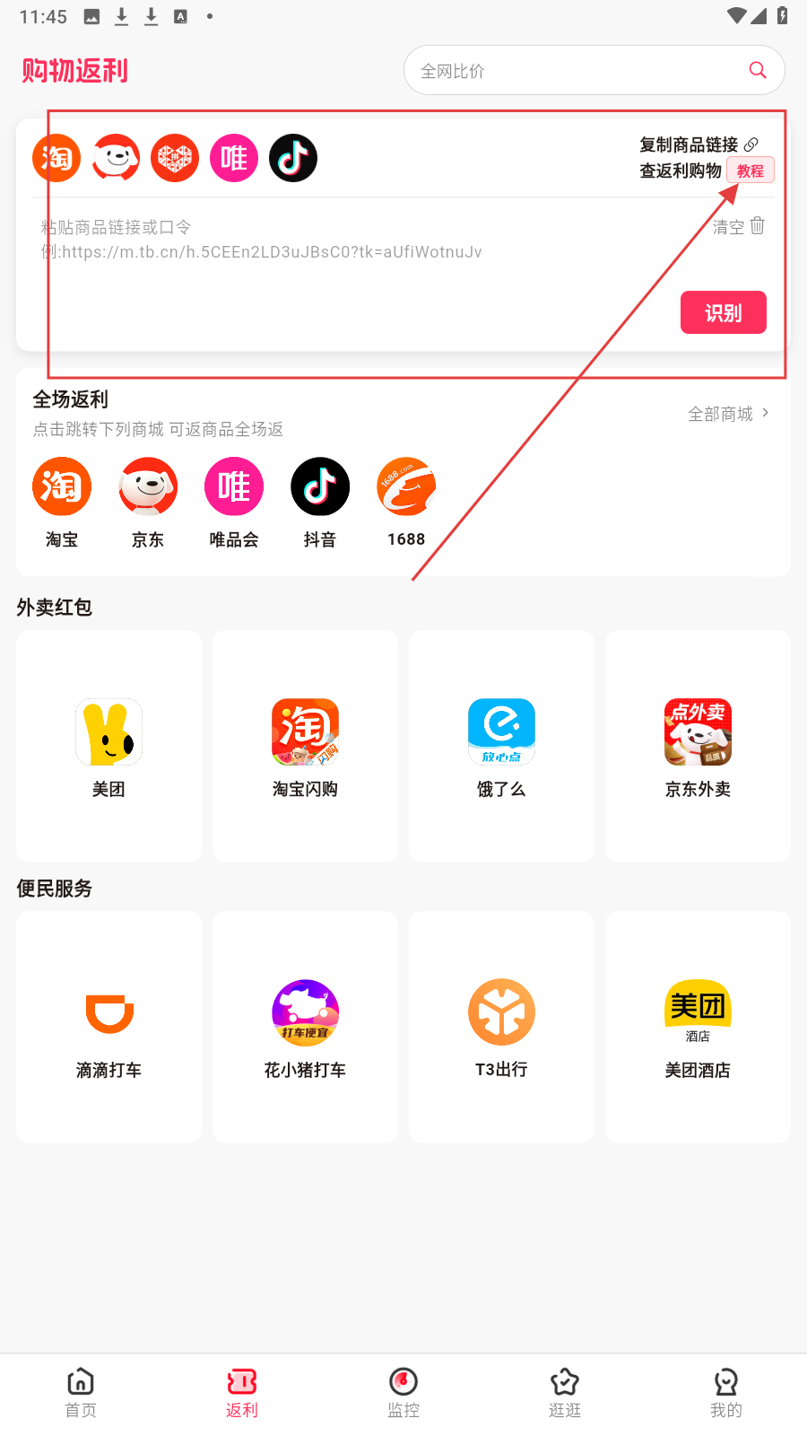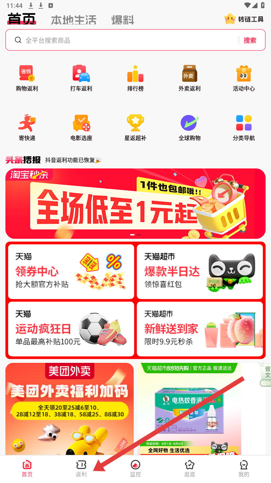 1、点击底部导航栏【返利】,进入购物返利页面。