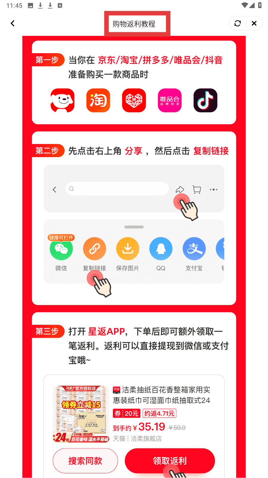 3、在教程页,查看在京东/淘宝/拼多多/唯品会/抖音等平台购物返利的步骤。